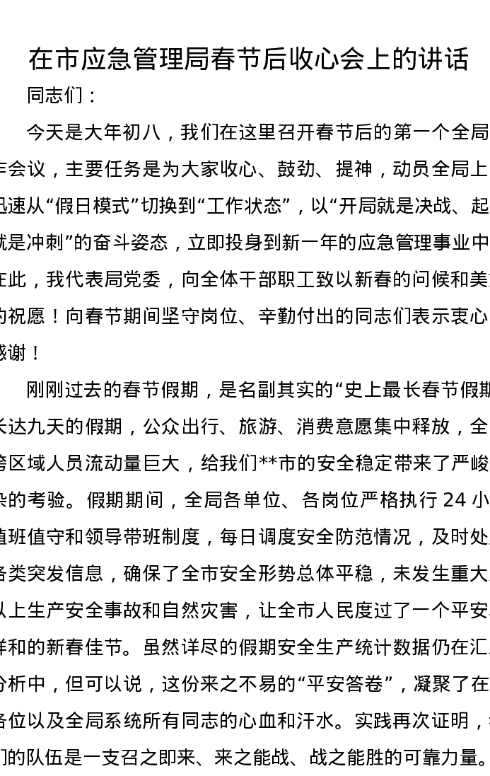 在市应急管理局春节后收心会上的讲话