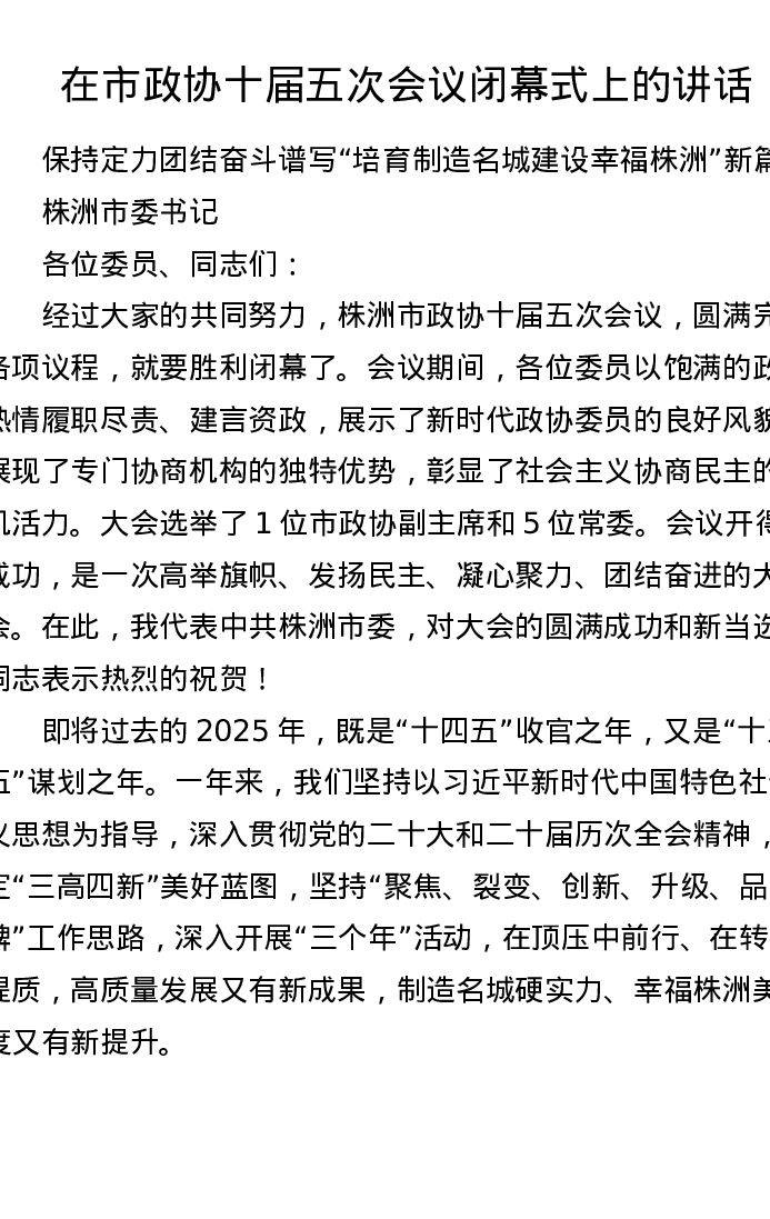 在市政协十届五次会议闭幕式上的讲话