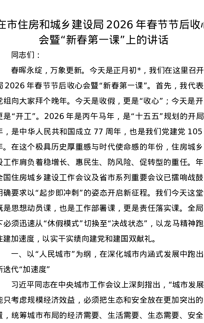 在市住房和城乡建设局2026年春节节后收心会暨新春第一课上的讲话