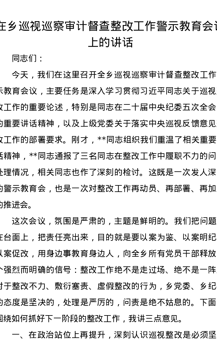 在乡巡视巡察审计督查整改工作警示教育会议上的讲话