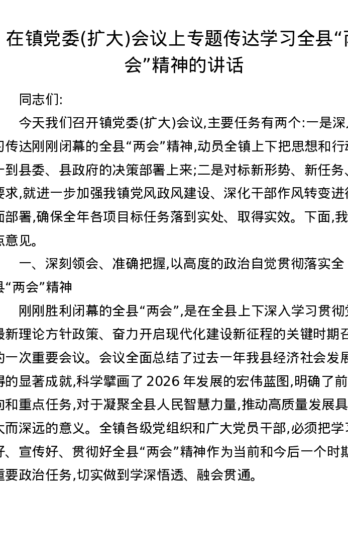 在镇党委(扩大)会议上专题传达学习全县两会精神的讲话