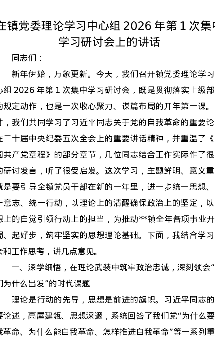 在镇党委理论学习中心组2026年第1次集中学习研讨会上的讲话