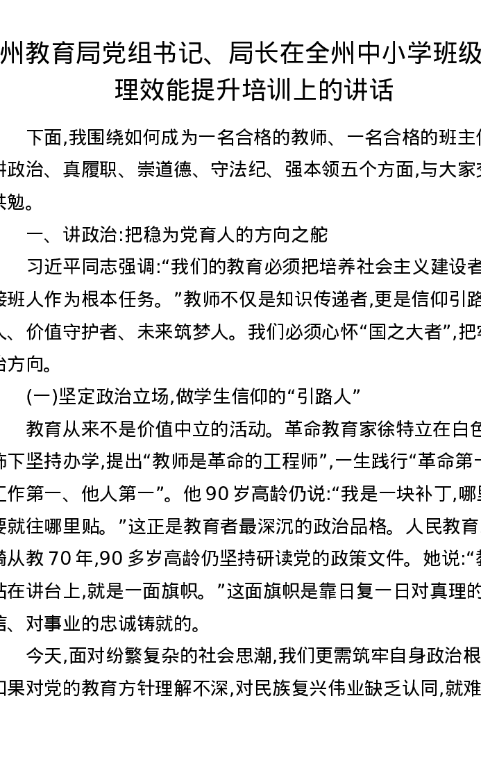 州教育局党组书记、局长在全州中小学班级管理效能提升培训上的讲话