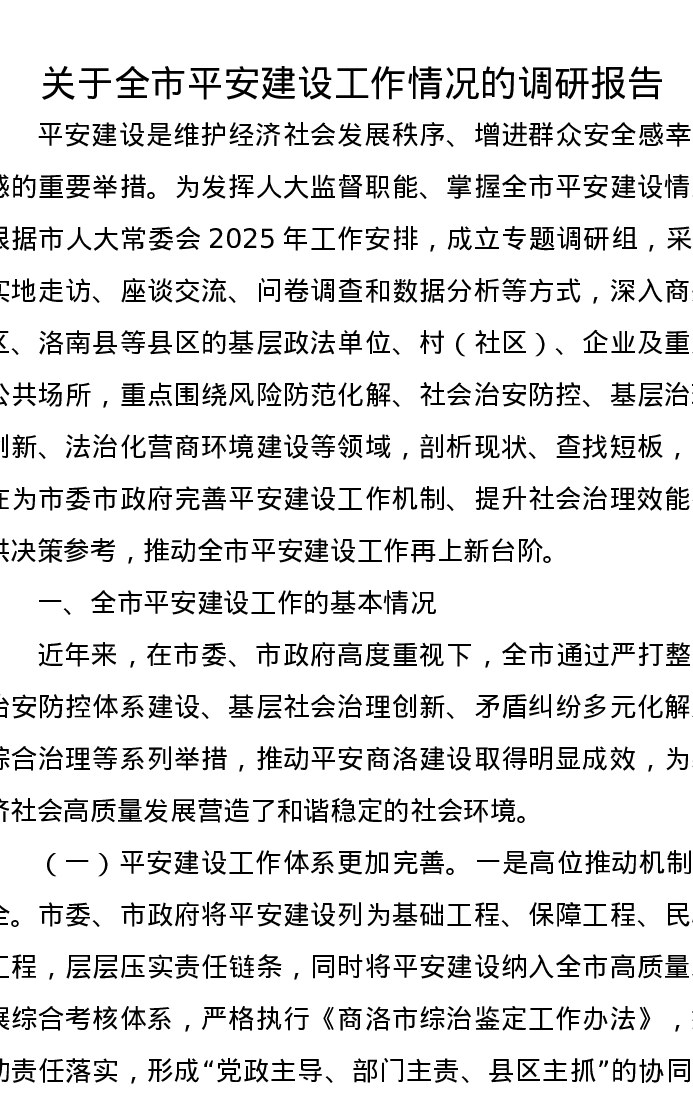 关于全市平安建设工作情况的调研报告