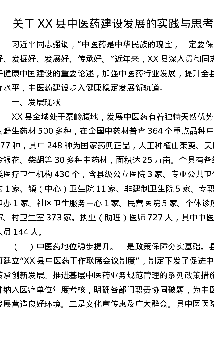 调研报告:关于XX县中医药建设发展的实践与思考