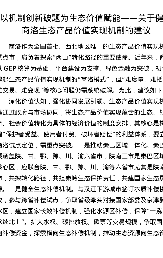 调研报告:以机制创新破题 为生态价值赋能——关于健全商洛生态产品价值实现机制的建议