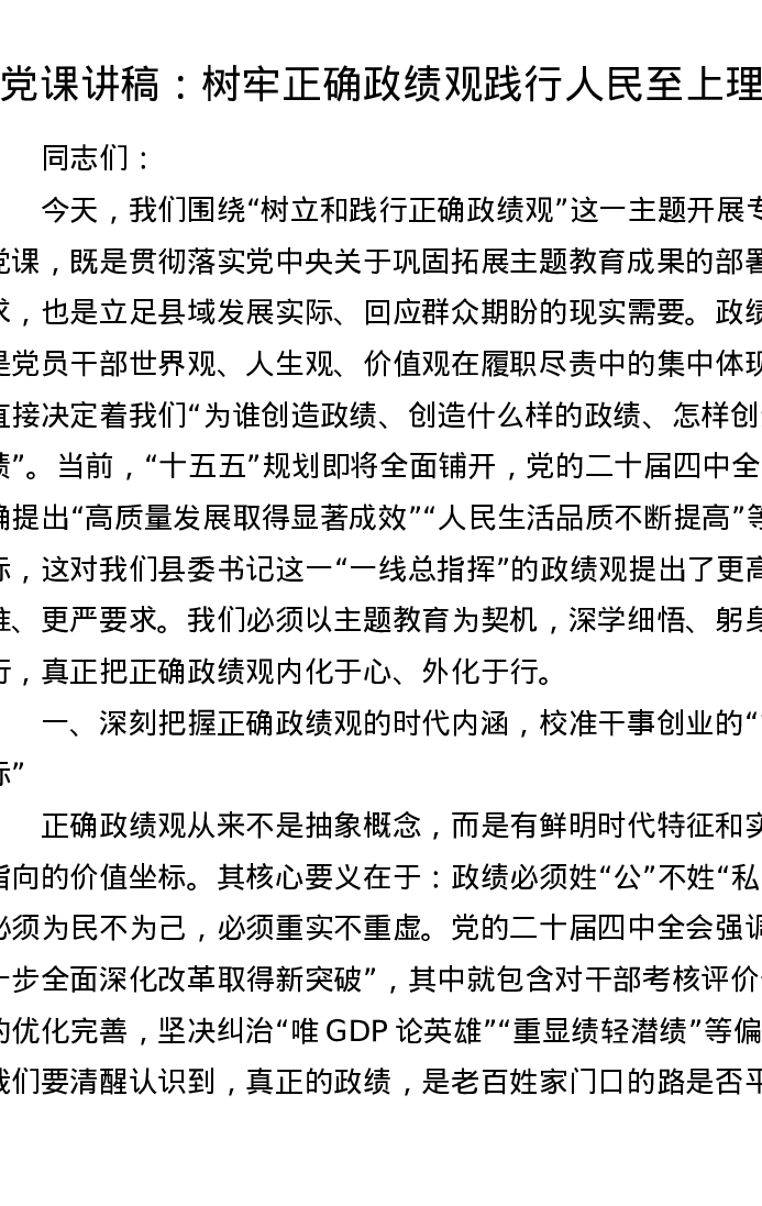 党课讲稿:树牢正确政绩观 践行人民至上理念