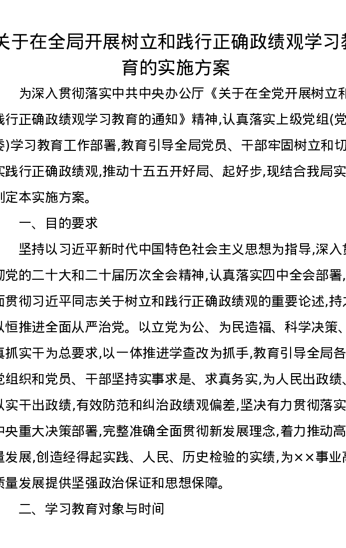 关于在全局开展树立和践行正确政绩观学习教育的实施方案