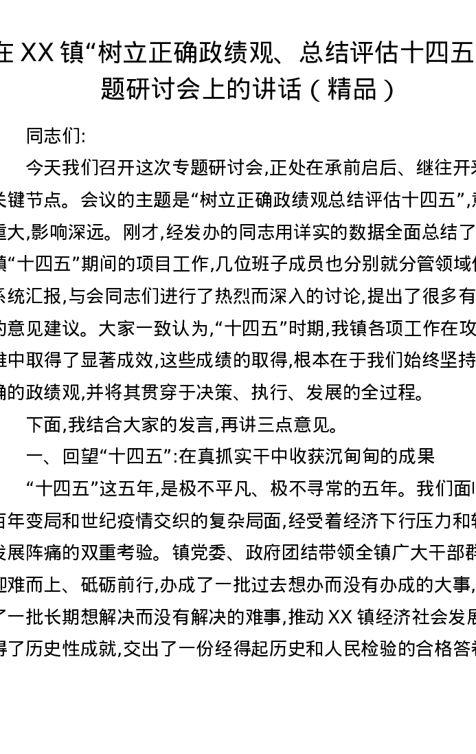 在XX镇树立正确政绩观、总结评估十四五专题研讨会上的讲话