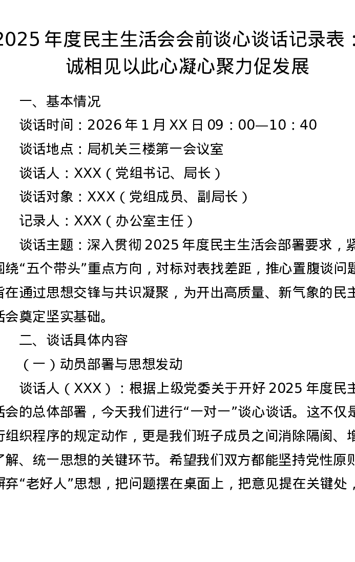 2025年度xxxxx会前谈心谈话记录表:坦诚相见以此心 凝心聚力促发展