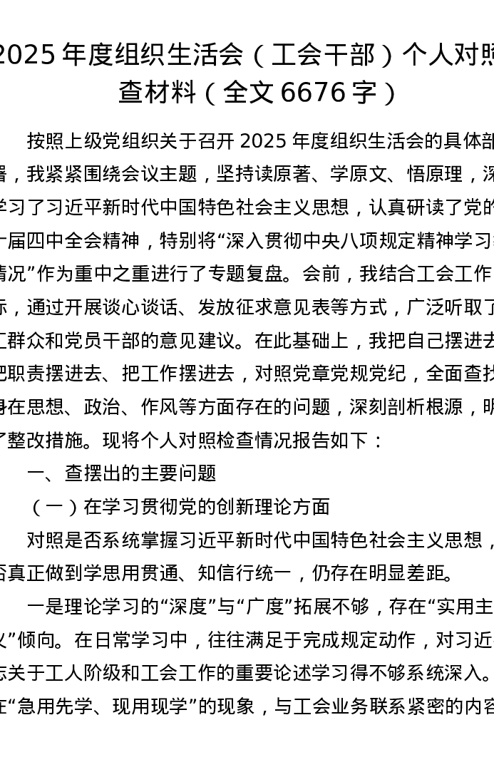 2025年度组织xxx(工会干部)个人对照检查材料(全文6676字)