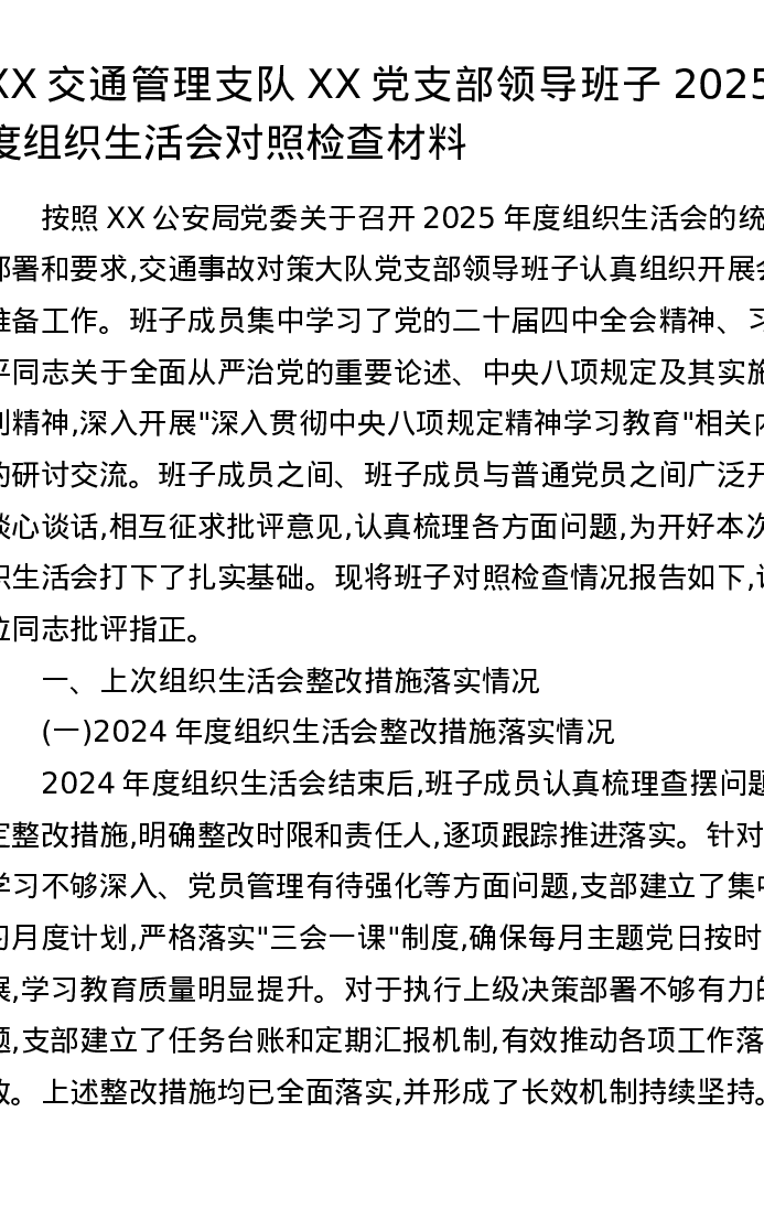 XX交通管理支队XX党支部领导班子2025年度组织xxx对照检查材料