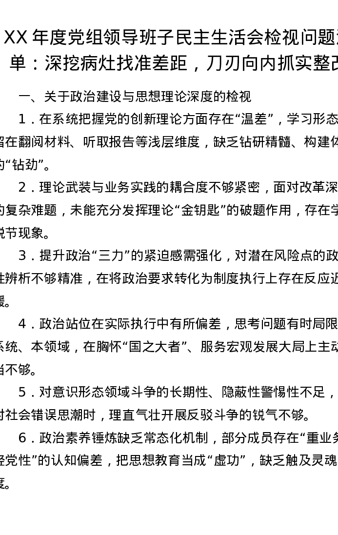 XX年度党组领导班子xxxxx检视问题清单:深挖病灶找准差距,刀刃向内抓实整改