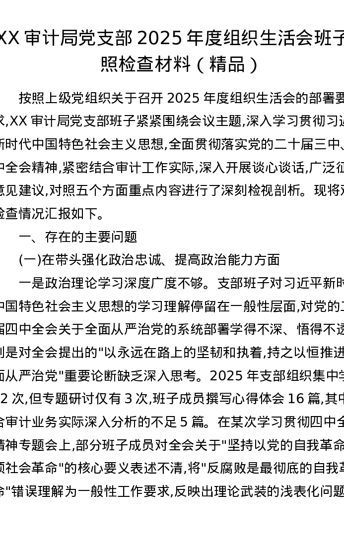 XX审计局党支部2025年度组织xxx班子对照检查材料