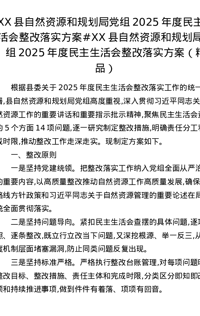 XX县自然资源和规划局党组2025年度xxxxx整改落实方案
