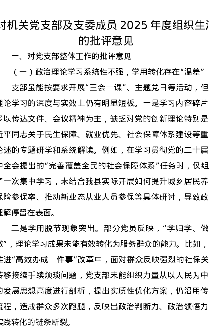 对机关党支部及支委成员2025年度组织xxx的批评意见