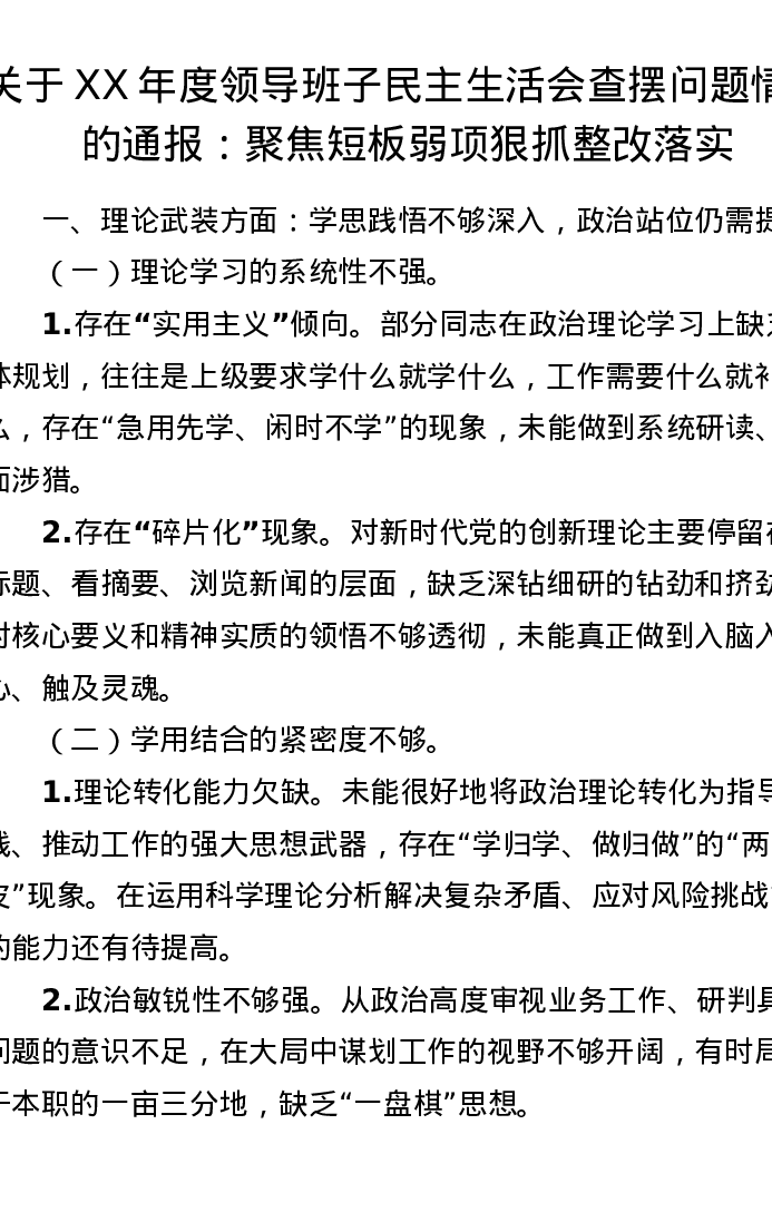 关于XX年度领导班子xxxxx查摆问题情况的通报:聚焦短板弱项 狠抓整改落实