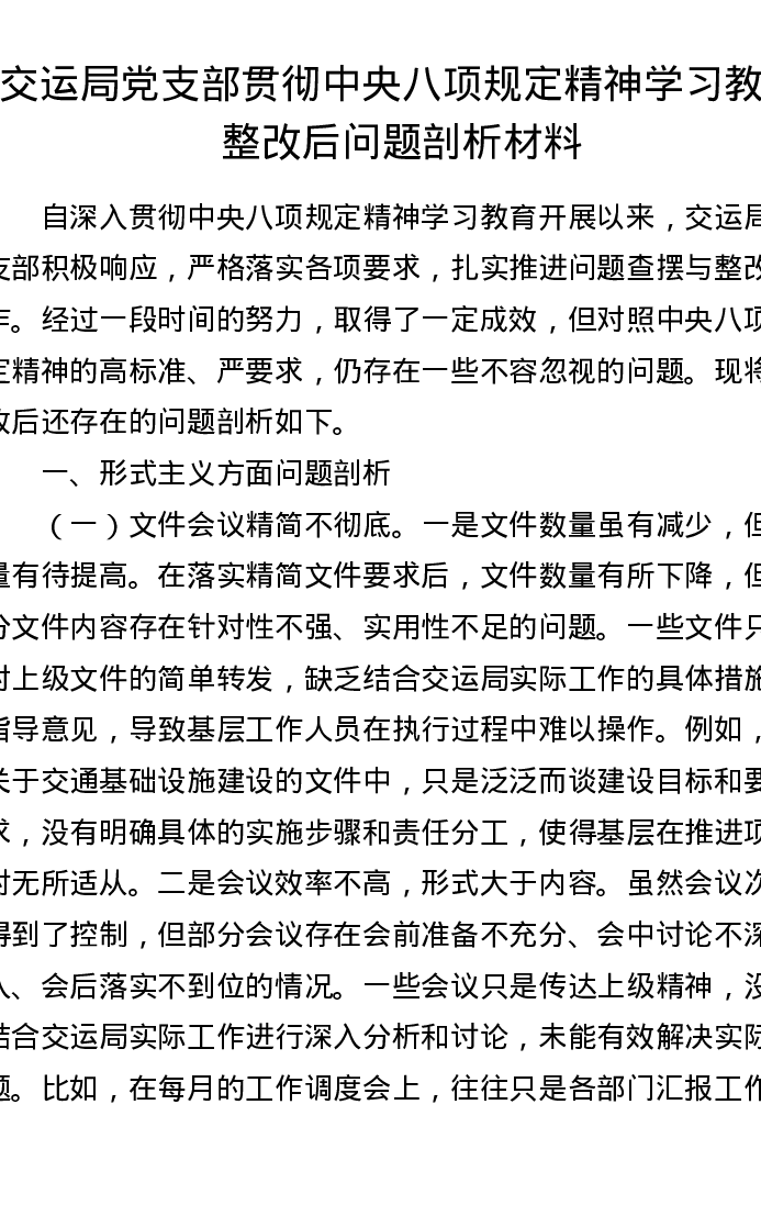 交运局党支部贯彻中央八项规定精神学习教育整改后问题剖析材料