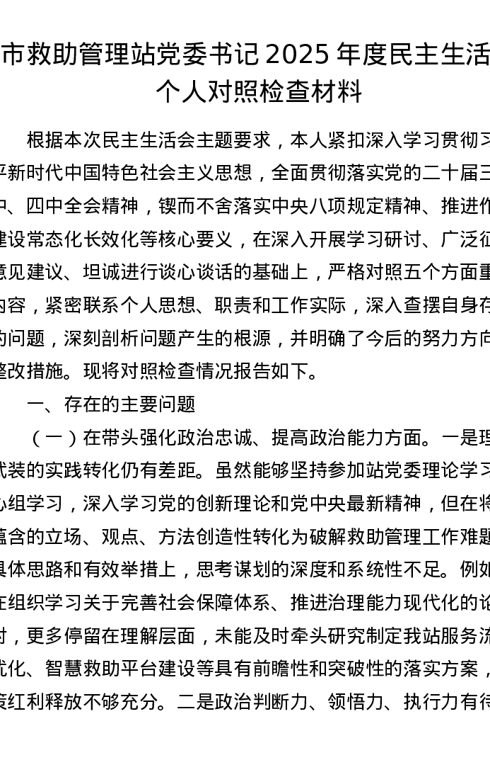 市救助管理站党委书记2025年度xxxxx个人对照检查材料