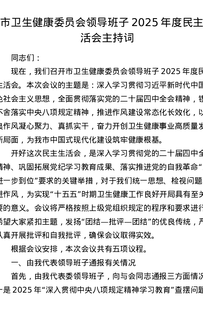 市卫生健康委员会领导班子2025年度xxxxx主持词
