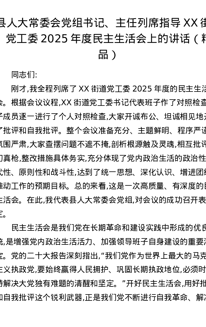 县人大常委会党组书记、主任列席指导XX街道党工委2025年度xxxxx上的讲话
