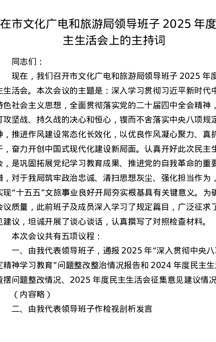 在市文化广电和旅游局领导班子2025年度xxxxx上的主持词