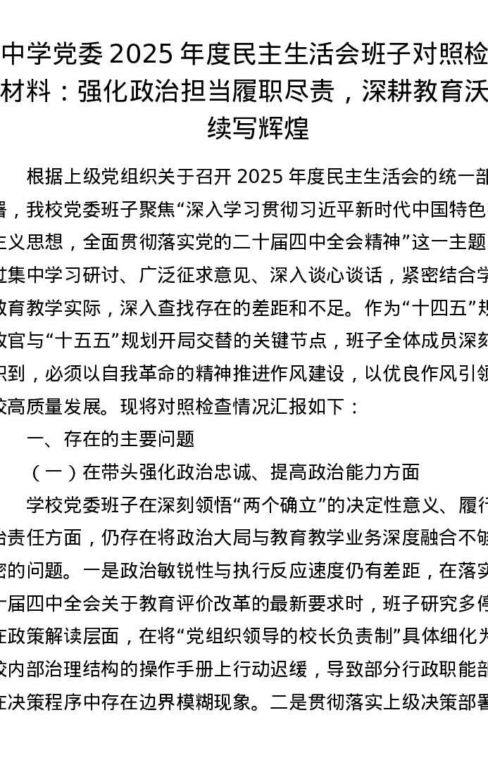 中学党委2025年度xxxxx班子对照检查材料:强化政治担当履职尽责,深耕教育沃土续写辉煌