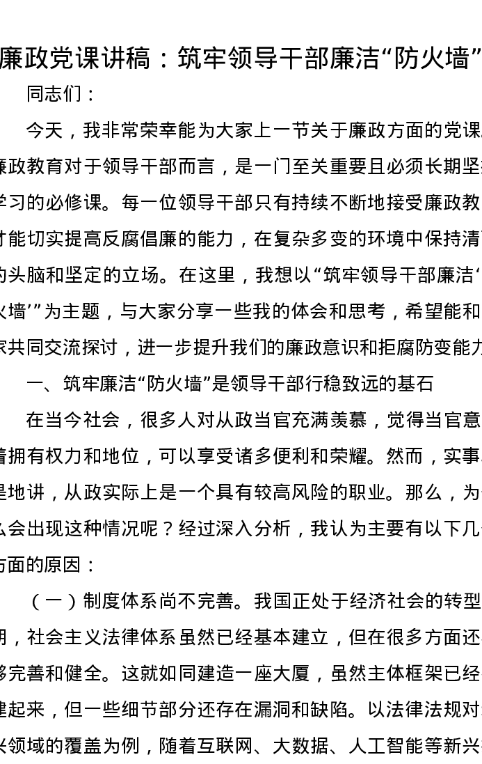 廉政党课讲稿:筑牢领导干部廉洁防火墙
