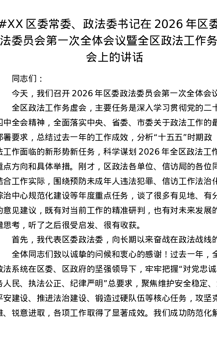 XX 区委常委、 政法委书记在 2026 年区委政法委员会第一次全体会议暨全区政法工作务虚会上的讲话
