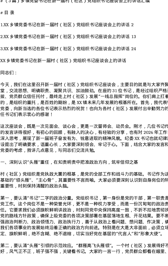 汇编:乡镇党委书记在新一届村(社区)党组织书记座谈会上的讲话3篇