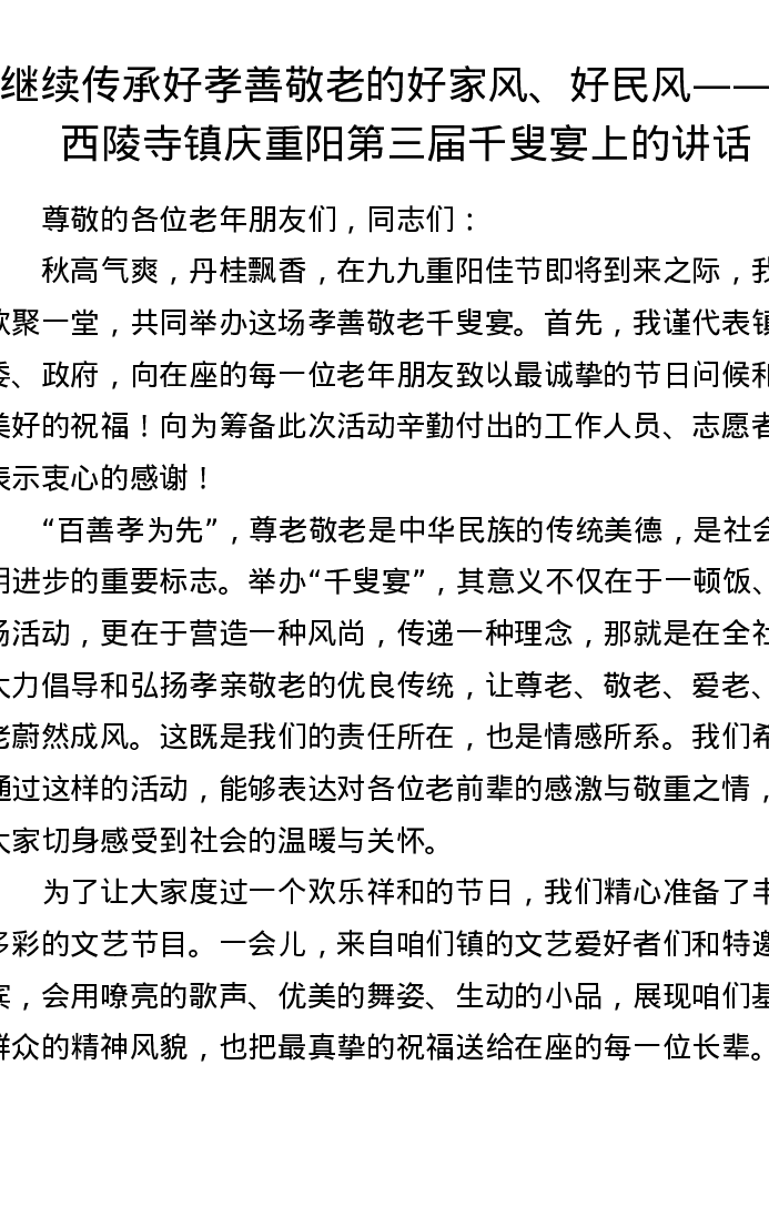 继续传承好孝善敬老的好家风、好民风——在西陵寺镇庆重阳第三届千叟宴上的讲话