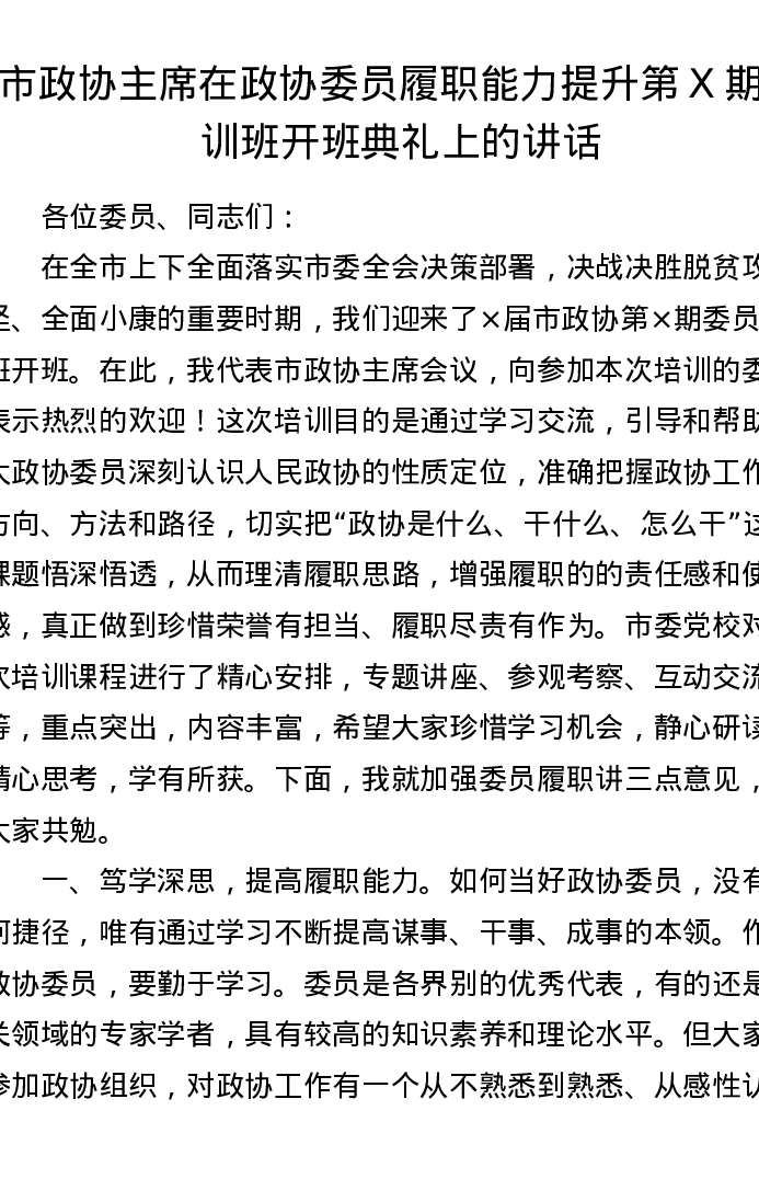 市政协主席在政协委员履职能力提升第X期培训班开班典礼上的讲话