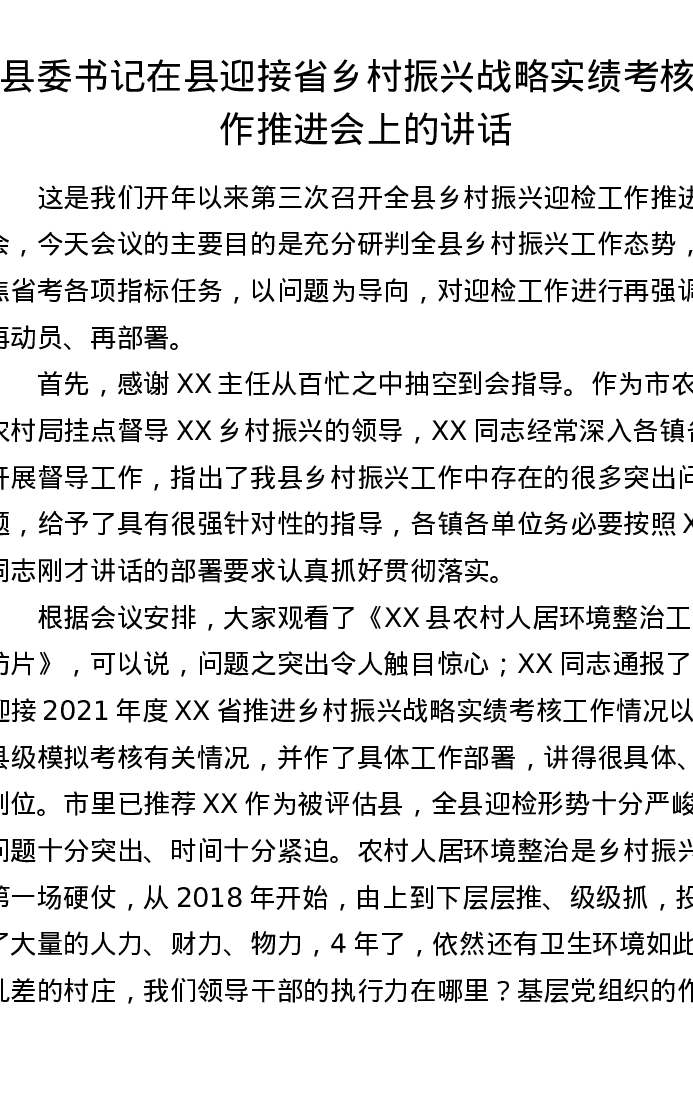 县委书记在县迎接省乡村振兴战略实绩考核工作推进会上的讲话