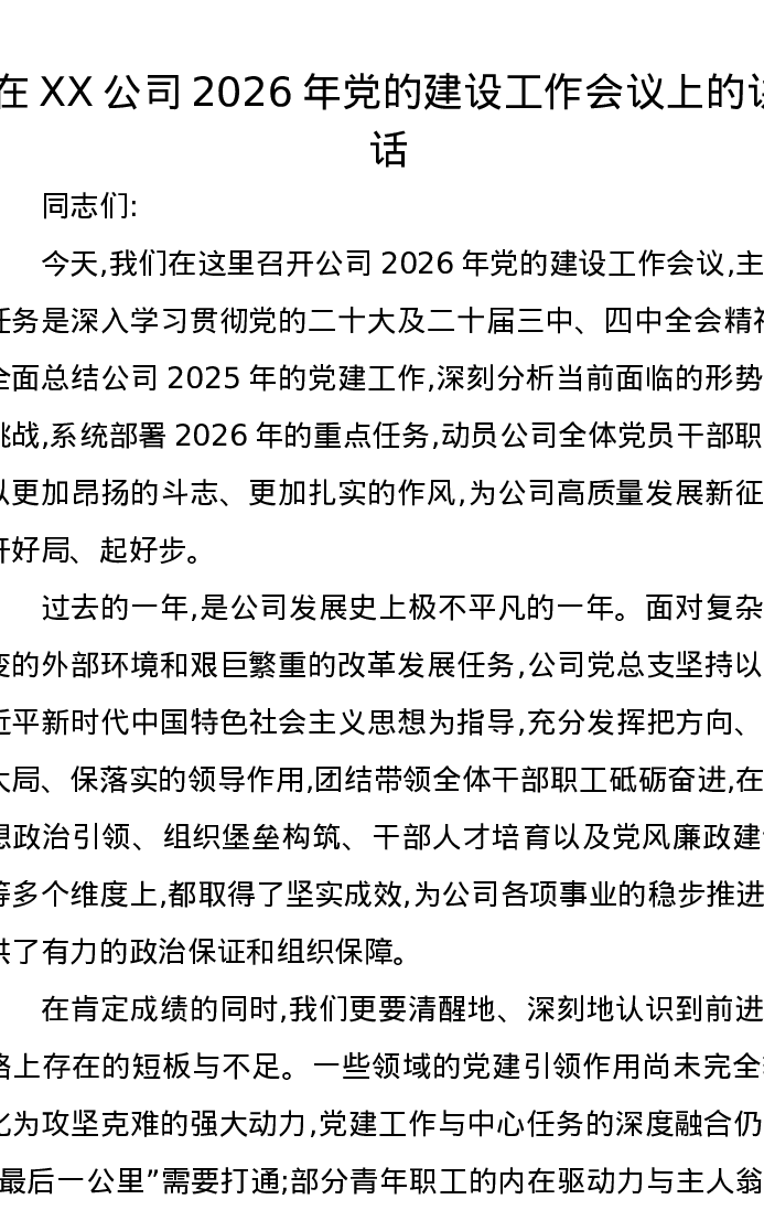 在XX公司2026年党的建设工作会议上的讲话
