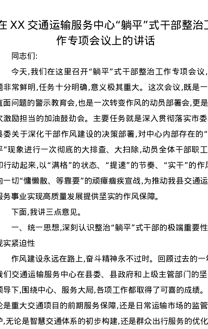 在XX交通运输服务中心躺平式干部整治工作专项会议上的讲话