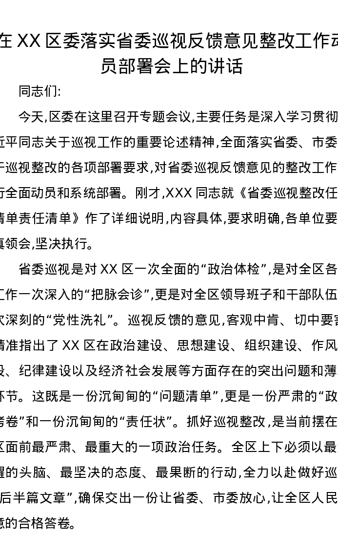 在XX区委落实省委巡视反馈意见整改工作动员部署会上的讲话