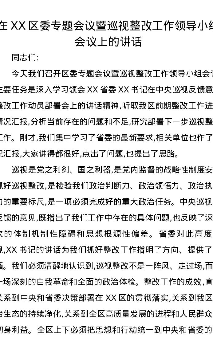 在XX区委专题会议暨巡视整改工作领导小组会议上的讲话 (2)