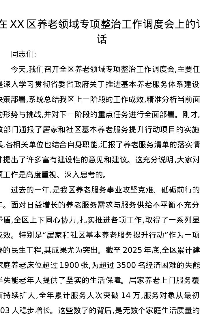 在XX区养老领域专项整治工作调度会上的讲话