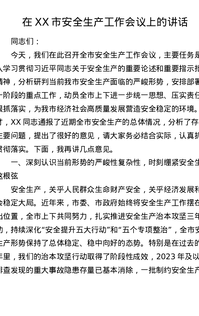 在XX市安全生产工作会议上的讲话