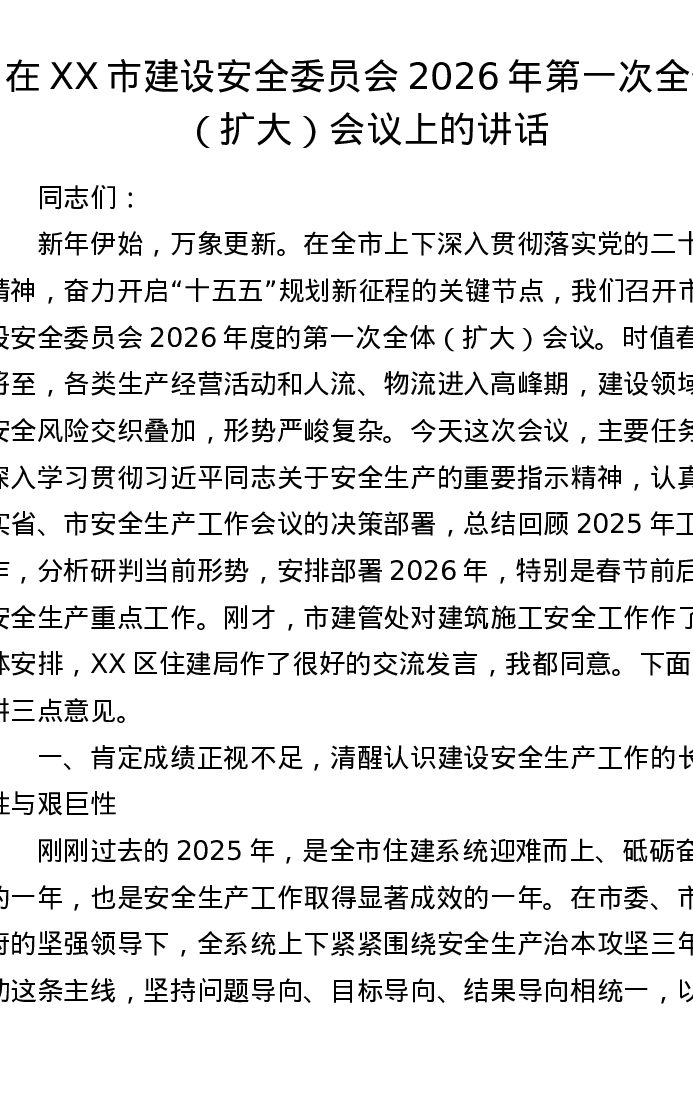 在XX市建设安全委员会2026年第一次全体(扩大)会议上的讲话