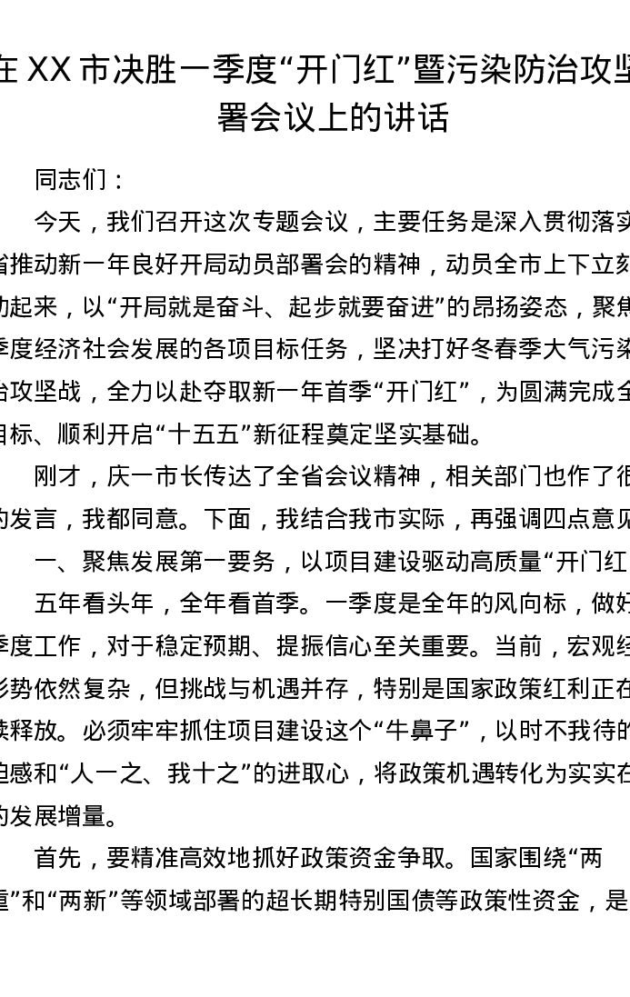 在XX市决胜一季度开门红暨污染防治攻坚部署会议上的讲话