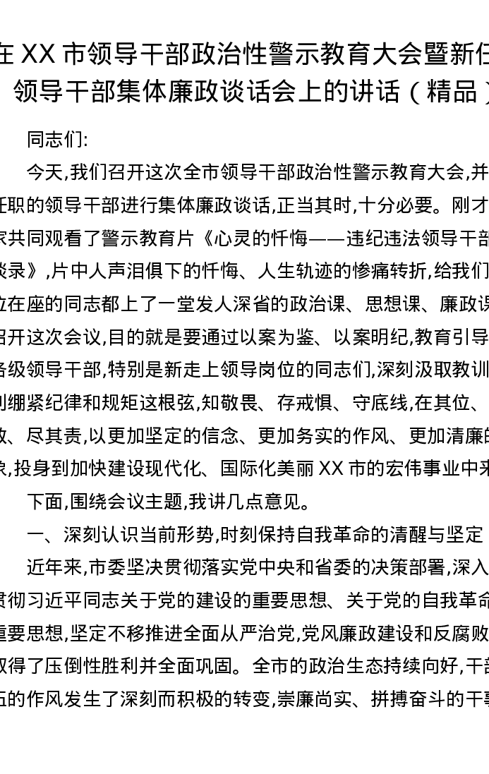 在XX市领导干部政治性警示教育大会暨新任职领导干部集体廉政谈话会上的讲话