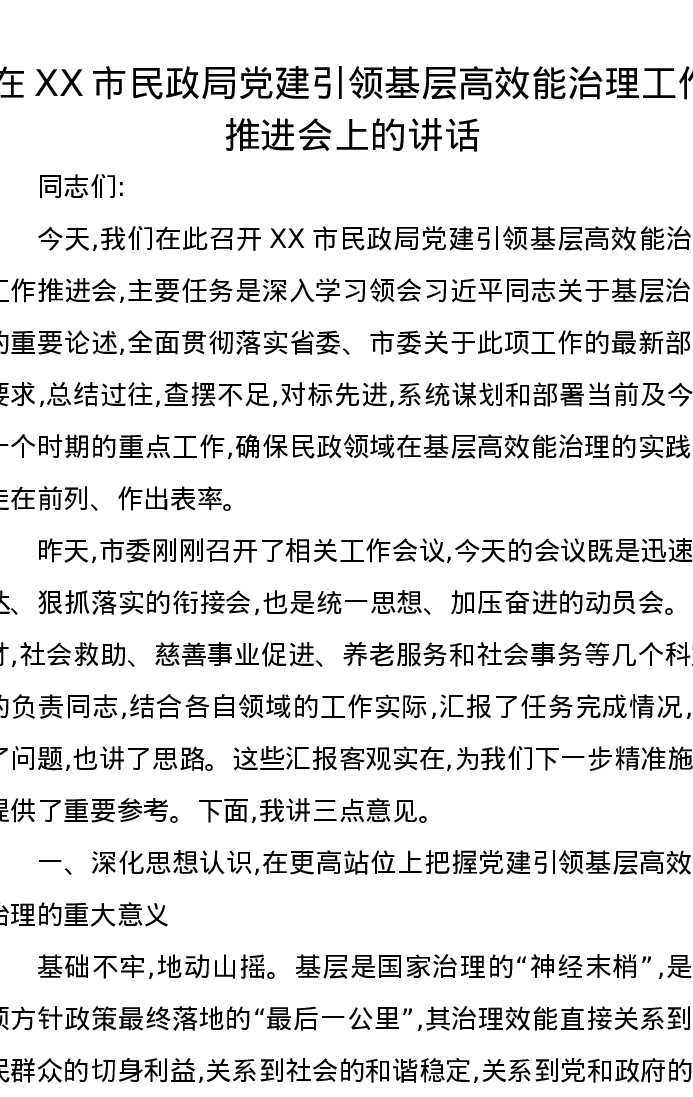 在XX市民政局党建引领基层高效能治理工作推进会上的讲话
