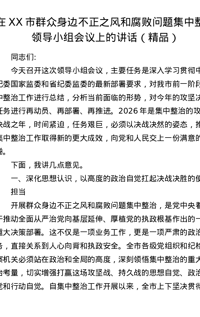 在XX市群众身边不正之风和腐败问题集中整治领导小组会议上的讲话
