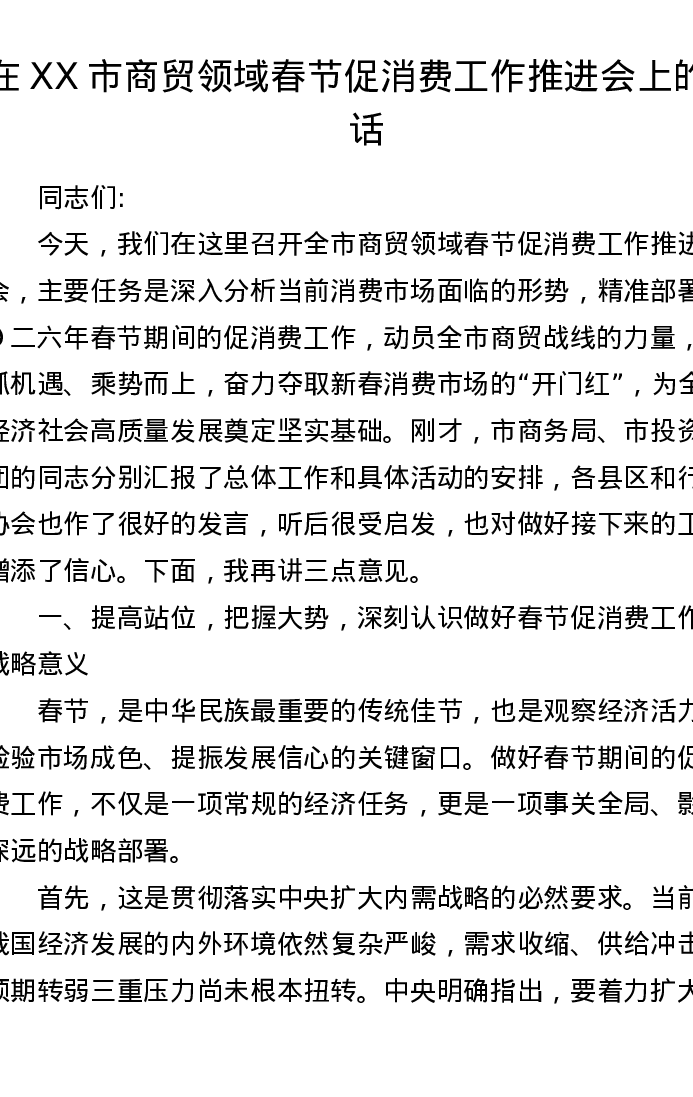 在XX市商贸领域春节促消费工作推进会上的讲话