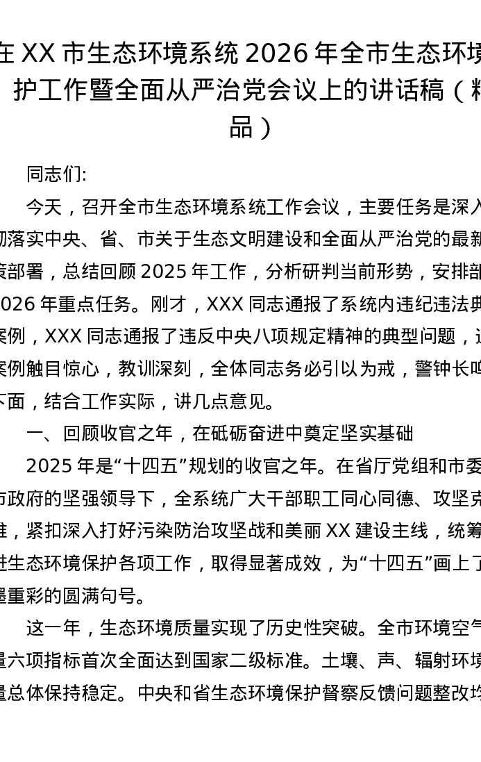 在XX市生态环境系统2026年全市生态环境保护工作暨全面从严治党会议上的讲话稿