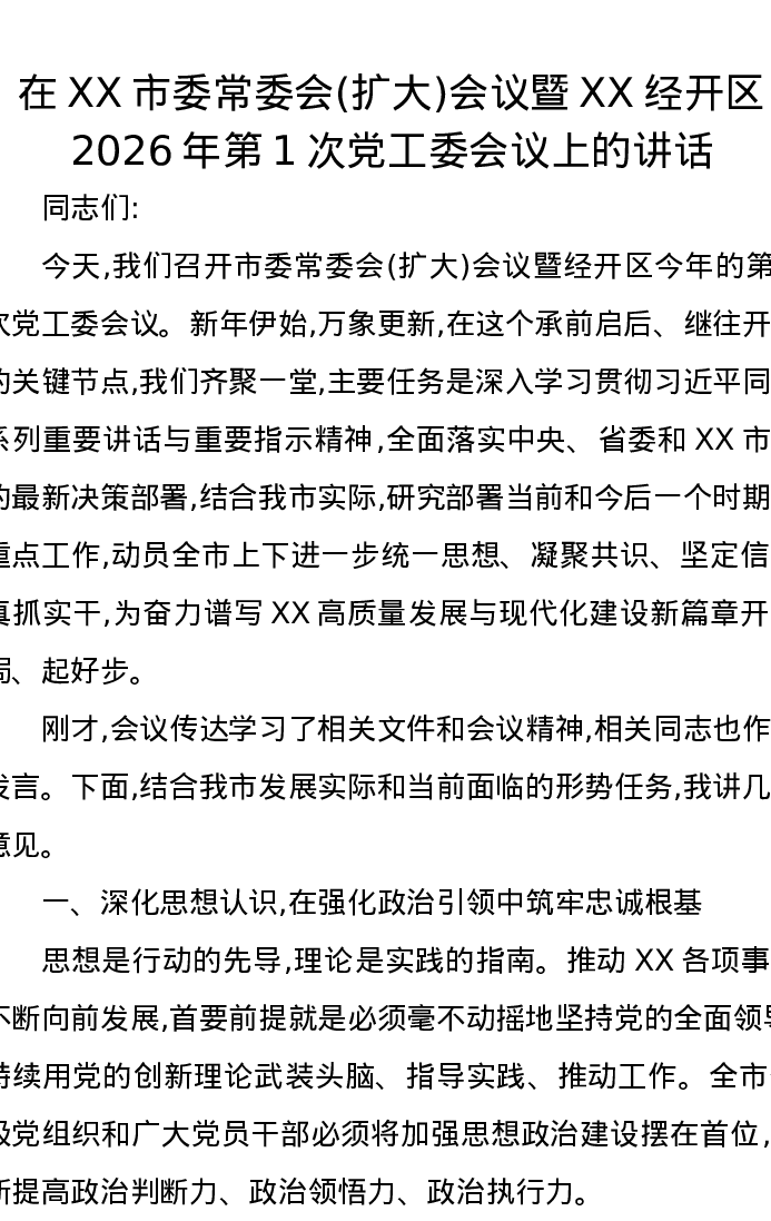 在XX市委常委会(扩大)会议暨XX经开区2026年第1次党工委会议上的讲话