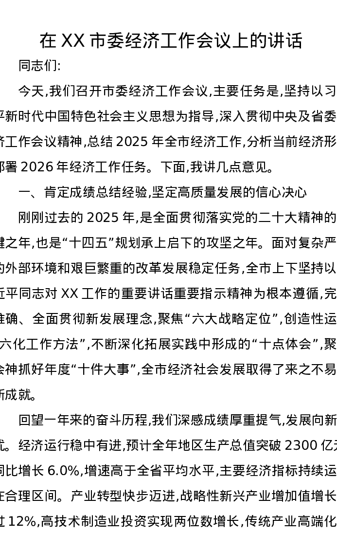 在XX市委经济工作会议上的讲话