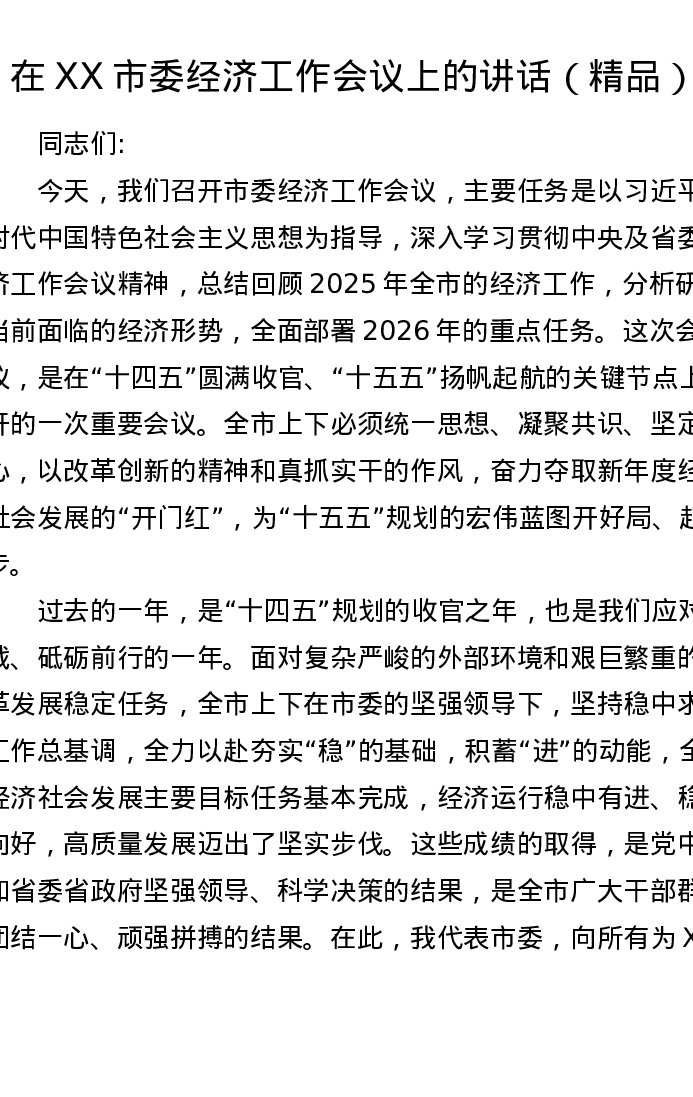 在XX市委经济工作会议上的讲话2