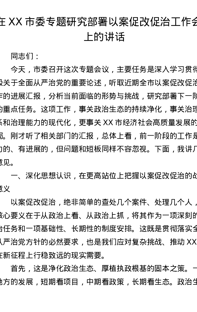 在XX市委专题研究部署以案促改促治工作会议上的讲话